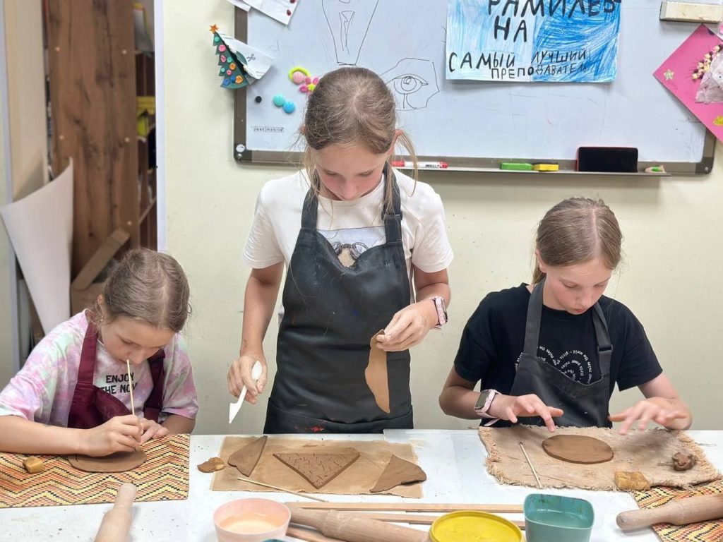 Студия снабжена необходимым оборудованием: это мольберты, столы для постановок, стеллажи, есть свои печи, в которых обжигаются работы из керамики и в конце смены дети с удовольствием забирают с собой.