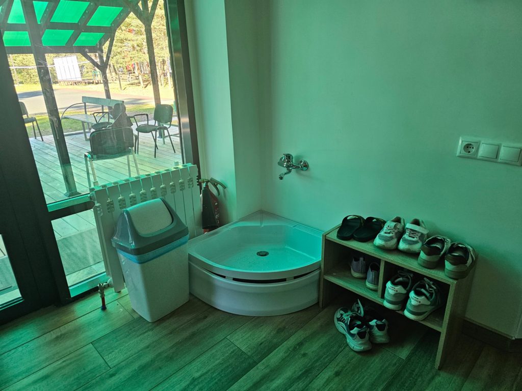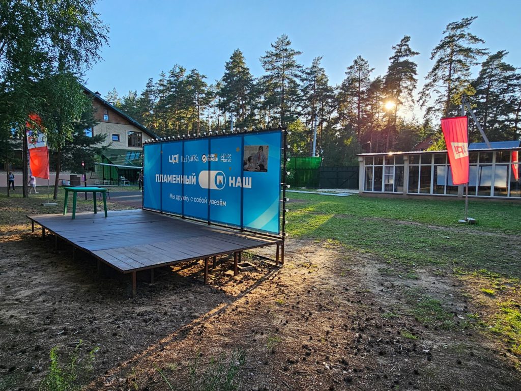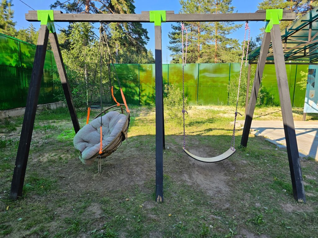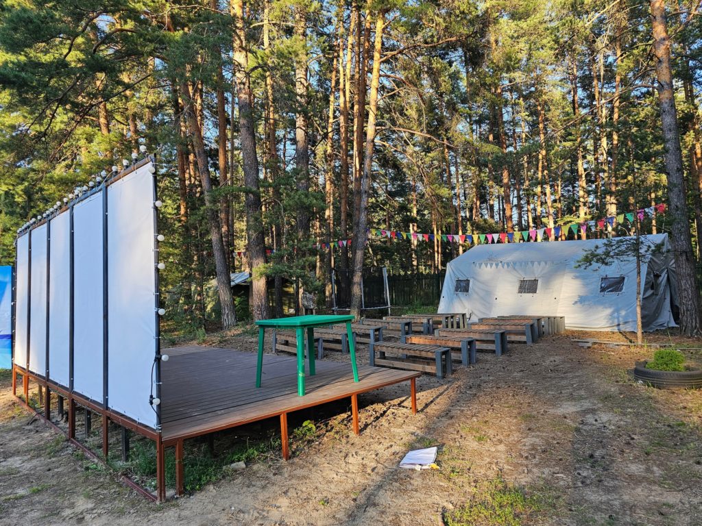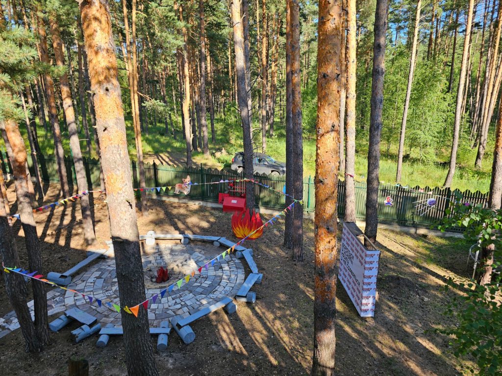 Инфраструктура: настольный теннис, батуты, качели, беседки, костровое место, волейбольная площадка с покрытием, палатки (шатры) для ночлега на улице. Для купания в жаркую погоду монтируется бассейн, дети загорают по желанию под присмотром. Тропа Паустовского в пешей доступности, детям организуют экскурсию в течение смены.