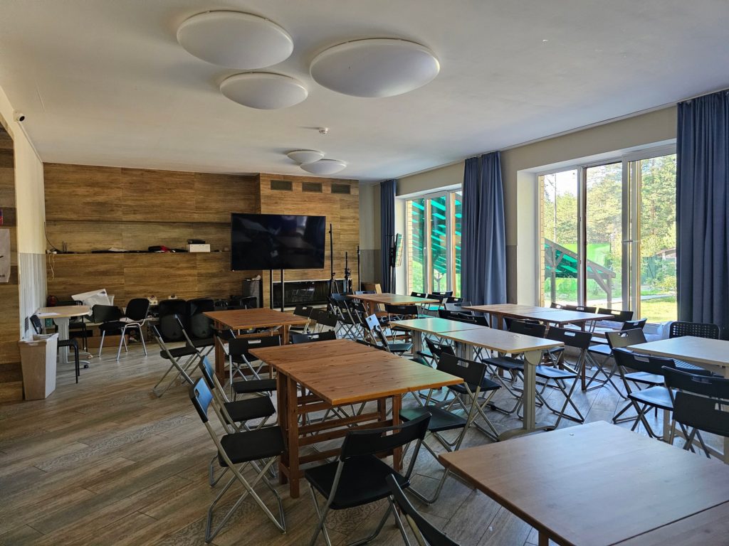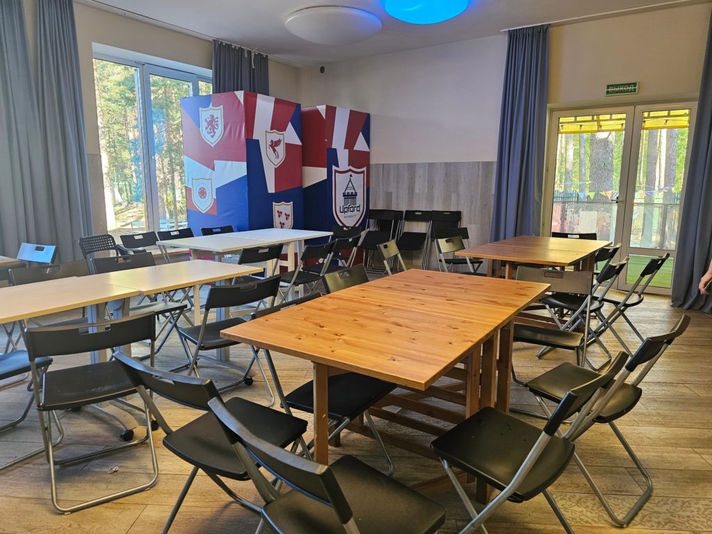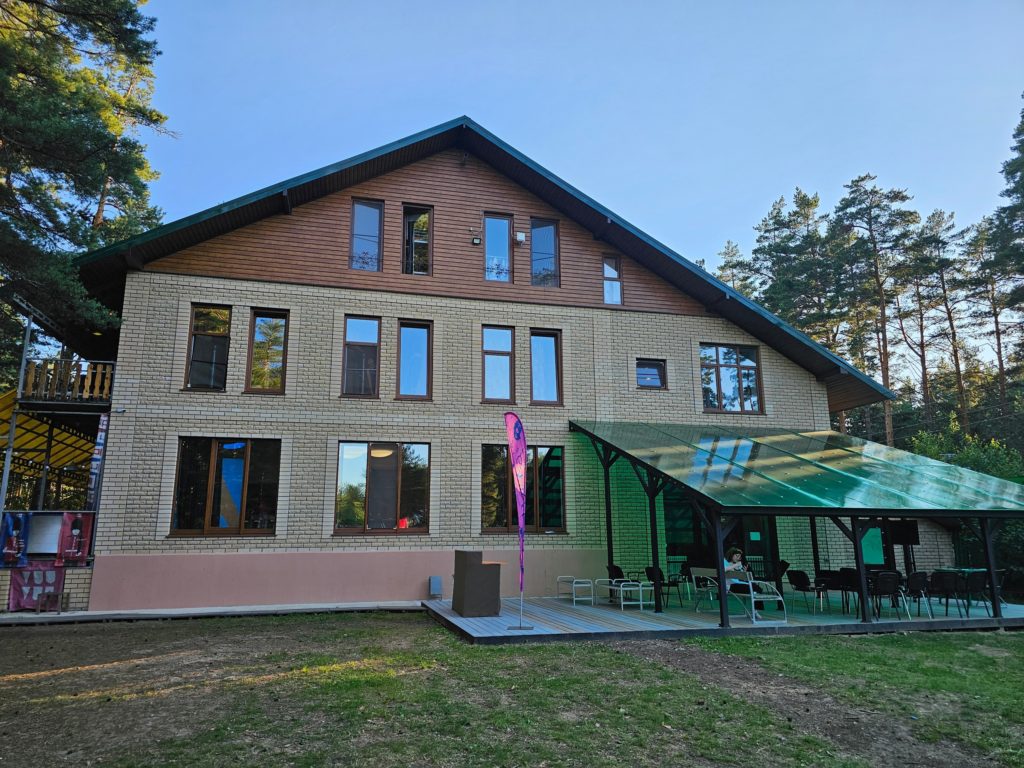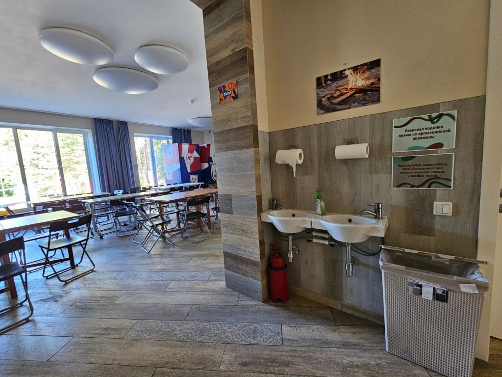 Условия проживания: светлые комнаты по 4,6,8 чел. с двух ярусными кроватями и удобствами в номере. Дети живут на 1 и 2-м этажах, педсостав на 3-м. На первом этаже просторная столовая с выходом на улицу, зимой в ней топят камин.