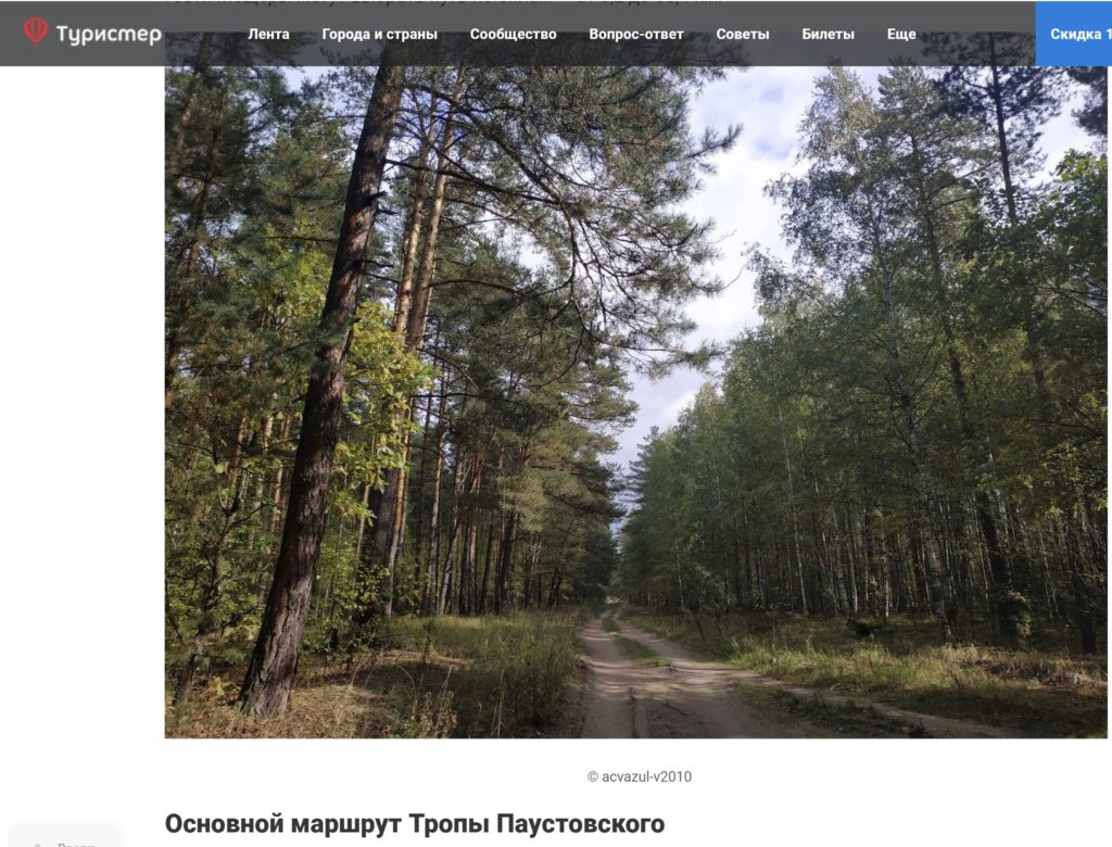 Прим. Тропа носит имя советского писателя, военного корреспондента, педагога Константина Георгиевича Паустовского неслучайно. Знаменитый литератор приехал в Мещеру в 1930 году и поселился в Солотче. Он очень любил гулять по окрестностям: природа края дарила душевное спокойствие и вдохновение. Прожив в поселке до 1954 г., Паустовский написал цикл «мещерских рассказов», в которых отразилась искренняя любовь писателя к Мещере, ее красоте и бесхитростному быту. В Национальном парке туристам доступны 8 маршрутов. Первый из них был создан в 2015 году активистами Экологического рязанского альянса. Постепенно количество троп увеличилось и сегодня гости Мещеры могут выбрать путь по силам — от 6,2 до 50,4 км. Тропа № 1 имела протяженность 6,8 км. Со временем маршрут дополнился новыми пунктами и переименовался в «Черное озеро». Теперь его длина достигает 30 км, но желающие могут сократить путь на отметках 6,2, 7,1, 15,4, 23,2 км.