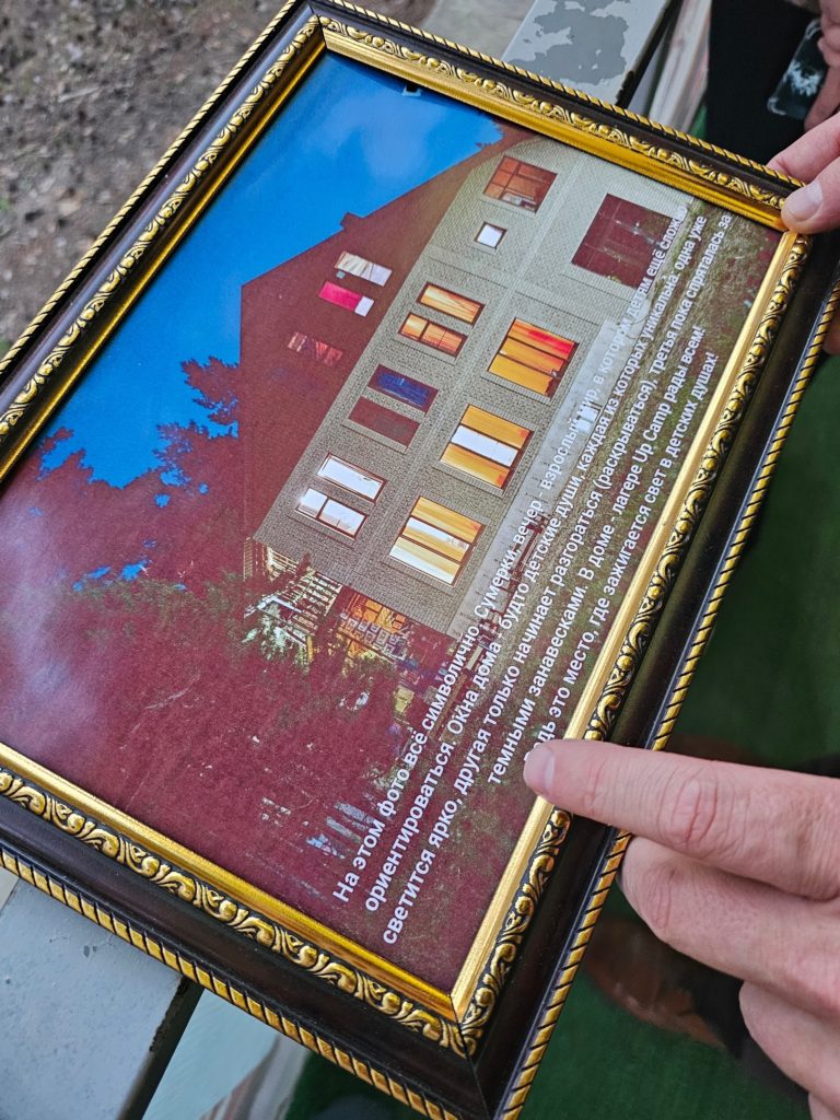 «На этом фото все символично. Сумерки, вечер — взрослый мир, в котором детям еще сложно ориентироваться. Окна дома — будто детские души, каждая из которых уникальна: одна уже светится ярко, другая только начинает разгораться /раскрываться/, третья пока спряталась за темными занавесками. В доме — лагере Up Camp рады всем! Ведь это место, где зажигается свет в детских душах!»