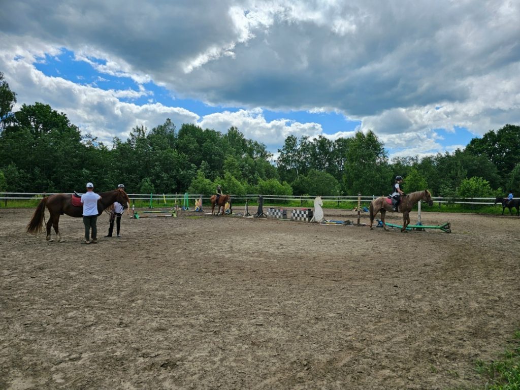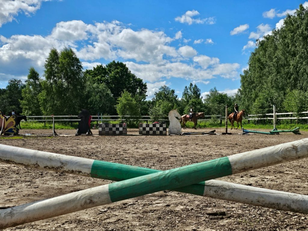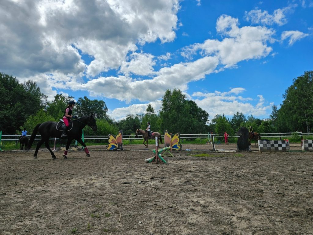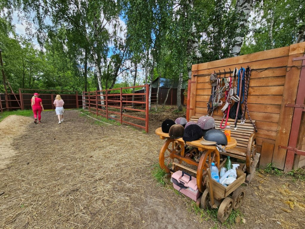 На территории комплекса есть несколько левад, где гуляют лошади. Там же дети их чистят и седлают. Манеж открытый, большой, разделен на части. Есть возможность одновременно тренироваться новичкам и опытным конникам.